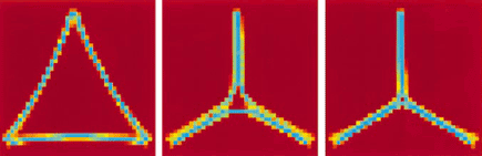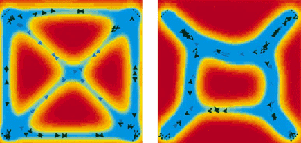 In der Entwicklung des Pfadsystem können sich die Muster ändern. Hier eine Rasenfläche mit vier Eingängen an den Ecken: Rote Flächen sind wenig attraktiv für Fußgänger (durch die kleinen schwarzen Dreiecke dargestellt), blaue dagegen besonders beliebt. Anfangs nehmen die Leute noch direkte Wege (Bild links), mit der Zeit können sich aber auch Kompromisse herausbilden, weil die Fußgänger lieber einem schon etwas ausgetreneren Pfad folgen und nicht unbedingt den kürzesten Weg wählen. Das Endergebnis entspricht dabei einem System, in dem Gesamtlänge aller Pfade möglichst klein ist.